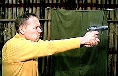Alexander Litvinenko, fires a pistol at a shooting gallery somewhere in