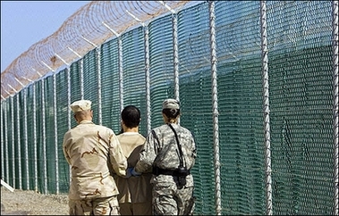 A detainee is escorted by military guards inside Camp Delta's Maximum Security area on the US Naval base at Guantanamo Bay, Cuba in 2006. [AFP]