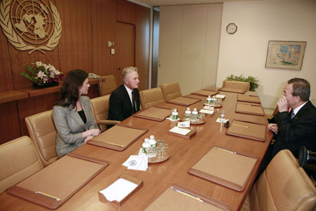 UN Secretary-General Ban Ki-Moon (R) meets with actor Michael Douglas (C), who is a UN Messenger of Peace and his wife Catherine Zeta-Jones in New York, March 6, 2007. [Reuters]