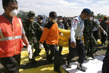 carry a body from the Garuda jet which crashed at Yogyakarta airport March