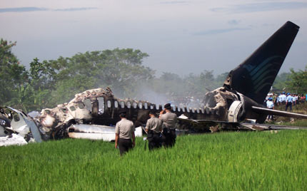 wreckage of a jet at Yogyakarta airport March 7, 2007. Four charred bodies