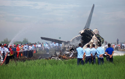 the wreckage of a jet at Yogyakarta airport March 7, 2007. Four charred