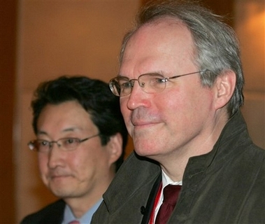US Assistant Secretary of State Christopher Hill, right, walks through a hotel lobby with Victor Cha, the US National Security Council's director for Asian Affairs, before heading to six-party talks on North Korea's nuclear program, in Beijing Thursday March 22, 2007. [AP]