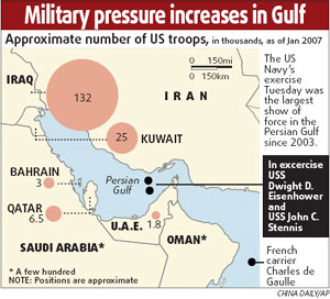 "If not well handled, any spark could cause a big fire to this explosive region," said Hua Liming, a former Chinese ambassador to Iran between 1991 and 1995. On Tuesday, US warplanes took off from two aircraft carriers in the US Navy's largest show of force in the Gulf since the 2003 invasion of Iraq. The maneuvers, involving 15 American ships and more than 100 aircraft, is sure to exacerbate tensions with Iran, which has frequently condemned the US military presence off its coastline. The exercises began only four days after Iran captured 15 British soldiers allegedly at the mouth of the Shatt al-Arab waterway, which marks the southern stretch of Iraq's border with Iran. All these activities remind people of the period just before the United States was about to attack Iraq four years ago," Hua said. "But even if the military deployment is completed, it is going to be extremely difficult for Washington to decide whether to use these forces." Bush, along with military officers at the Pentagon, might paint a picture in their minds of overthrowing a hostile regime in the region, but they will have to spend even more time thinking seriously about the consequences once the first cannon is fired, Hua said.