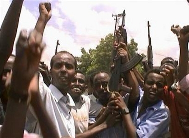 Somali insurgents raise their AK-47 rifles in celebration as