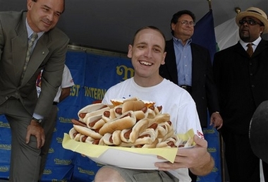 The Japanese title holder declared himself ready to gorge, dismissing suggestions by skeptics that his stiff jaw was nothing more than hot dog head games aimed at rattling world record holder Chestnut. "I don't care what they think," the 29-year-old said through an interpreter. "I just want to battle tomorrow." Since going public with his ailment last month, Kobayashi underwent treatment by a specialist and a chiropractor. Event organizers said he also had a wisdom tooth extracted June 26 to relieve what they described as "jaw-thritis." The slender Kobayashi weighed in at 154 pounds. Chestnut, 23, came in at 215 pounds and added his voice to those unsure what to expect from the champion. "Kobayashi is the underdog," he said, "and he's claiming an illness." The two are among 17 contestants preparing for Wednesday's eat-off, where the winner must consume the most HDBs - hot dogs and buns. Last month, Chestnut eclipsed Kobayashi's mark of 53 1/2 in 12 minutes by inhaling 59 1/2. Urged by photographers to open wide on Tuesday, Kobayashi displayed less than a full range of mandible motion. That could be good news for Chestnut, who's favored to end Kobayashi's record run as holder of the mustard yellow belt presented each Fourth of July outside Nathan's Famous. Mayor Michael Bloomberg introduced the pair before they stepped on the scales and engaged in a staredown at City Hall Park. "Many times ... in the annals of sports, the eyes of the world have turned to our great city to watch worthy adversaries square off," said Bloomberg, tongue in cheek. "What comes to mind is Ali and Frazier, the Yankees and the Mets, the Post and the Daily News." And, this year, Kobayashi and Chestnut. |