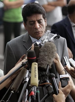 Adel Tolba speaks to the media as he leaves for North Korea at Beijing's