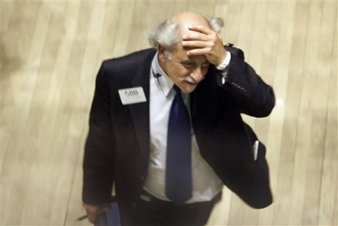 Trader Peter Tuchman rubs his head as he works or the floor