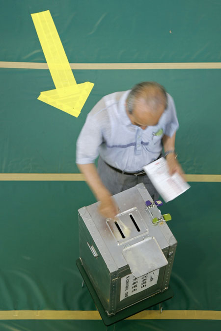 A man casts his vote for a Japanese upper house election into a ballot box at a polling station in Tokyo July 29, 2007. Prime Minister Shinzo Abe made a last-ditch effort on Saturday to woo voters ahead of an upper house election in which his ruling bloc looks set to lose its majority, a result that could cost him his job.[Reuters]