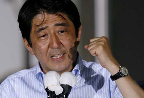 Japan's Prime Minister Shinzo Abe speaks to voters on the last day of a stumping tour before the Sunday's upper house election in Tokyo July 28, 2007. Abe made a last-ditch effort to woo voters on Saturday ahead of an upper house election in which his ruling bloc looks set to lose its majority, a result that could cost him his job. [Xinhua]