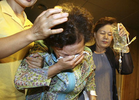 The mother (C) of Shim Sung-min, a 29-year-old man who was kidnapped and killed by the Taliban in Afghanistan, cries after watching television news about Shim in Seongnam, south of Seoul, July 31, 2007. The second South Korean hostage shot dead by Taliban insurgents in Afghanistan was identified on Tuesday as Shim, a former IT firm employee who did volunteer work to help the poor. [Reuters]