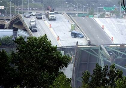 7 Killed in Minneapolis Bridge Collapse(Agencies)Updated: 2007-08-02 08:25 Minneapolis - An interstate bridge jammed with rush-hour traffic suddenly broke into huge sections and collapsed into the Mississippi River Wednesday, pitching dozens of cars 60 feet into the water and killing at least seven people. The eight-lane Interstate 35W bridge, a major Minneapolis artery, was in the midst of being repaired and two lanes in each direction were closed when the bridge buckled. About 20 families gathered at an information center, looking for information on loved ones they couldn't locate. "There were two lanes of traffic, bumper to bumper, at the point of the collapse. Those cars did go into the river," said Minneapolis Police Lt. Amelia Huffman. "At this point there is nothing to suggest that this was anything other than a structural collapse." By 1 a.m. Thursday, Hennepin County Sheriff Rich Stanek said all search efforts had been called off for the night and that searchers did not expect to find any survivors. "It's dark, it's not safe with the currents in the water and the concrete and rebar," he said. "At this point it is a recovery effort." Jamie Winegar of Houston was sitting in traffic shortly after 6 p.m. when all of a sudden she started hearing "boom, boom, boom and we were just dropping, dropping, dropping, dropping." The car she was riding in landed on top of a smaller car but did not fall into the water. She said her nephew yelled, "'It's an earthquake!' and then we realized the bridge was collapsing." Minneapolis Fire Chief Jim Clack said 60 people were taken to area hospitals for treatment and that the death toll could rise. Rescuers called off the search as nightfall made it too dangerous to search the waters, which were filled with chucks of the mangled bridge and at least 50 vehicles in the water. "We think there are several more vehicles in the river we can't see yet," Clack said, adding that the likelihood of finding survivors was slim. Authorities referred family members searching for missing loved ones to a nearby hotel, where the Red Cross had set up operations. Dr. Joseph Clinton, emergency medical chief at Hennepin County Medical Center, said his hospital treated 28 injured people -- including six who were in critical condition. Clinton said at least one of the victims had drowned. The Homeland Security Department also said the collapse did not appear to be terrorism-related. The National Transportation Safety Board planned to send a team of investigators to Minneapolis, NTSB spokesman Ted Lopatkiewicz said. Gov. Tim Pawlenty said the bridge was inspected by the Minnesota Department of Transportation in 2005 and 2006 and that no structural problems were noted. "There were some minor things that needed attention," he said. Police Chief Tim Dolan said officers were checking other bridges as a precaution. The steel-arched bridge, which was built in 1967, rose about 64 feet above the river and stretched about 1,900 feet across the river. The bridge was built with a single 458-foot-long steel arch to avoid putting any piers in the water that might interfere with river navigation. A burning truck and a school bus clung to one slanted slab. The bus had just crossed the bridge before it crumpled into pieces. Christine Swift's 10-year-old daughter, Kaleigh, was on the bus returning from a field trip and called her mother. "She was screaming, 'The bridge collapsed!'" Swift said. She said a police officer told her all the kids got off the bus safely. It appeared that the center section of the bridge dropped straight down and pancaked in the middle of the river, leaving several vehicles stranded on a broken island of wreckage. As divers plumbed the waters, other rescuers searched frantically for victims amid broken, zigzagged sections of blacktop. Some of the injured were carried up the riverbanks. Dozens of vehicles were scattered and stacked on top of each other amid the rubble. Some people were stranded on parts of the bridge that weren't completely in the water. Many motorists may have been headed to the Minnesota Twins game not far from the bridge. Team officials decided to play the game after conferring with department of public safety officials. It was decided that sending 20,000 to 25,000 people back into traffic could hinder rescue efforts, said team president Dave St. Peter. Catherine Yankelevich survived a 1994 earthquake in Northridge, Calif., and was on the I-35W bridge when it began to shake. "Cars started flying and I was falling and saw the water," she said. After her car plunged into the river, she climbed out the driver's side window and swam to shore uninjured. Road crews had been working on the 40-year-old bridge's deck, joints, guardrails and lights this week. "None of it would be related to the structure," said Bob McFarlin, assistant to Minnesota Transportation Commissioner Carol Molnau. The bridge was scheduled for inspection this fall, he said. Tom Sloan, head of the bridge division for Progressive Contractors Inc. said his company had 18 workers on the bridge at the time of the collapse and one was unaccounted for on Wednesday night. Three were hospitalized, while several others were treated for minor injuries, he said. "Obviously, this is a catastrophe of historic proportions for Minnesota,"