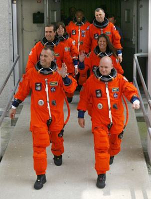 The crew of the space shuttle Endeavour leaves crew quarters for the launch pad at Kennedy Space Center in Cape Canaveral, Florida August 8, 2007. Clockwise from lower left are Pilot Charles Hobaugh, Rick Mastracchio, Barbara Morgan, Alvin Drew Jr., David Williams of the Canadian Space Agency, Tracy Caldwell, and Mission Commander Scott Kelly. The crew is set for launch aboard Endeavour on a mission to the International Space Station. [Reuters]