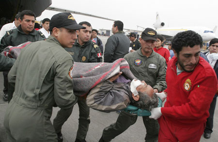 An injured man is carried on arrival at the Police Airport in Lima August 16, 2007, after an earthquake struck Pisco city. Peruvians pulled hundreds of dead from the rubble of homes and churches on Thursday and bodies piled up on street corners after the huge earthquake ravaged the country's central coast. [Reuters]