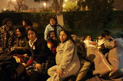 People prepare to spend the night outside their homes in Lima's port of Callao, after an earthquake struck Peru, August 15, 2007. [Reuters]