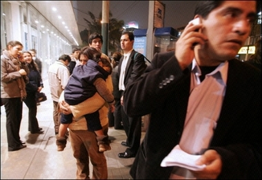 Civil Defense Commander Aristides Mussio released the figures on Peru's state television station, saying one person was killed in Lima and 336 in the region of Ica. The Civil Defense death toll of 337 first appeared on its website, but the organization's spokesman, Dario Ariola, refused to confirm the figure, which was much higher the numbers provided by the health minister. But minutes later Mussio appeared on television to announce the new death toll. Deputy Health Minister Jose Calderon called the situation in Ica "dramatic." Seventeen people were killed when a church collapsed Wednesday evening in the city of Ica, south of Lima, according to cable news station Canal N. The government rushed police, soldiers, doctors and aid to Ica, but an APTN cameraman trying to reach the city reported that traffic was paralyzed on the Pan American Highway by giant cracks in the pavement and fallen power lines. He said hundreds of vehicles were backed up. News reports said dozens of people were crowding hospitals in the city seeking help even though the hospitals had suffered cracks and other structural damage. Ica was blacked out as were smaller towns along the coast south of Lima. Residents of Chincha, a small town 90 miles southeast of Lima, reported that walls of homes had fallen in and numerous people had been hurt by falling bricks and broken glass. An APTN cameraman who reached Chincha said the floors of the local hospital were covered with dead bodies. The US Geological Survey said Wednesday's earthquake hit at 6:40 pm (7:40 pm EDT) about 90 miles southeast of Lima at a depth of about 25 miles. Four strong aftershocks ranging from magnitudes of 5.4 to 5.9 were felt afterward. The Hawaii-based Pacific Tsunami Warning Center issued a tsunami warning for the coasts of Peru, Chile, Ecuador, Colombia, Costa Rica and Panama. A tsunami watch was issued for the rest of Central America and Mexico and an advisory for Hawaii. The center canceled all the alerts after about two hours, but it said the quake had caused an estimated 10-inch tsunami near the epicenter. "It wasn't big enough to be destructive," said Stuart Weinstein, the center's assistant director. An Associated Press photographer said that some homes had collapsed in the center of Lima and that many people had fled into the streets for safety. The capital shook for more than a minute. "This is the strongest earthquake I've ever felt," said Maria Pilar Mena, 47, a sandwich vendor in Lima. "When the quake struck, I thought it would never end." Antony Falconi, 27, was desperately trying to get public transportation home as hundreds of people milled on the streets flagging down buses in the dark. "Who isn't going to be frightened?" Falconi said. "The earth moved differently this time. It made waves and the earth was like jelly." The quake also knocked out telephone and mobile phone service in the capital and to the provinces, making it impossible to communicate with the Ica area. Firefighters were called to put out a fire in a shopping center. State doctors called off a national strike that began on Wednesday to handle the emergency. Police reported that large boulders shook loose from hills and were blocking the country's Central Highway, which heads east into the Andes mountains. President Alan Garcia also said public schools would be closed Thursday because the buildings may be unsafe. The last time a quake of magnitude 7.0 or larger struck Peru was in September 2005, when a 7.5 magnitude earthquake rocked Peru's northern jungle, killing four people. In 2001, a 7.9-magnitude quake struck near the southern Andean city of Arequipa, killing 71 people. The latest Peru quake occurred in a subduction zone where one section of the Earth's crust dives under another, said USGS geophysicist Dale Grant at the National Earthquake Information Center in Golden, Colorado. Some of the world's biggest quakes strike in subduction zones including the catastrophic Indian Ocean temblor in 2004 that generated deadly tsunami waves. |