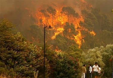 Meanwhile, a fire broke out on the fringes of Athens a day after a massive effort prevented the birthplace of the Olympics from being devastated by flames. Dimitris Papangelopoulos, who is responsible for prosecuting terrorism and organized crime, ordered the investigation to determine "whether the crimes of arsonists and of arson attacks on forests" could come under Greece's anti-terrorism law, the ministry said in a statement. The probe also will seek to establish the identities of the alleged perpetrators. Greece has been ravaged by hundreds of massive wildfires since Friday that have left at least 61 people dead. The country also suffered fires in June and July, although they were not nearly on the same scale. Government officials have said they suspect at least some of the blazes have been caused by arson. The government has offered a reward of up to $1.36 million for anyone providing information that would lead to the arrest of an arsonist. "So many fires breaking out simultaneously in so many parts of the country cannot be a coincidence," Prime Minister Costas Karamanlis said in a nationally televised address on Saturday. "The state will do everything it can to find those responsible and punish them." Several people have been arrested on suspicion of arson since Friday, although some were accused of starting fires through negligence rather than intent. One man, however, was charged with arson and homicide in connection with a fire near the southern town of Areopolis on Friday that killed six people. Forest fires are common during Greece's hot, dry summers - but nothing has approached the scale of the last three days. |