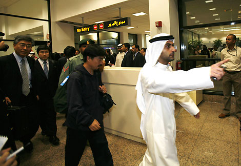 The South Koreans held hostage by the Taliban in Afghanistan arrive at Dubai airport in the United Arab Emirates August 31, 2007. They were freed after the South Korean government reached a deal with the Taliban. [Reuters]