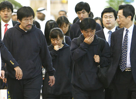 The South Koreans held hostage by the Taliban in Afghanistan arrive at Dubai airport in the United Arab Emirates August 31, 2007. They were freed after the South Korean government reached a deal with the Taliban. [Reuters]