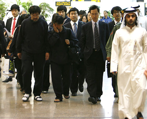 The South Koreans held hostage by the Taliban in Afghanistan arrive at Dubai airport in the United Arab Emirates August 31, 2007. They were freed after the South Korean government reached a deal with the Taliban. [Reuters]