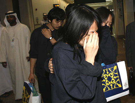 The South Koreans held hostage by the Taliban in Afghanistan arrive at Dubai airport in the United Arab Emirates August 31, 2007. They were freed after the South Korean government reached a deal with the Taliban. [Reuters]