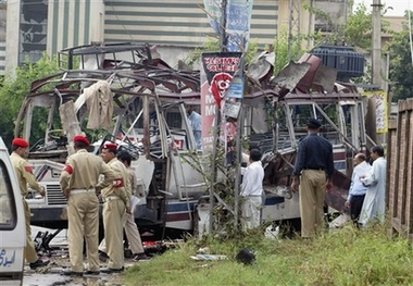 There was no immediate claim of responsibility for the explosions, which injured dozens and deepened the sense of crisis in Pakistan amid political uncertainty ahead of elections. Officials suggested the bombings were the work of Islamic militants. The first bomb exploded on the bus early Tuesday morning as it traveled through Rawalpindi, a garrison city about seven miles south of Islamabad. Military spokesman Maj. Gen. Waheed Arshad said the bus belonged to the Ministry of Defense, and police said many of the victims were soldiers. Television pictures showed how the blast had ripped the roof off the white bus and blown out all the windows. As ambulances transported victims from the bus blast, a second bomb triggered on a motorcycle went off in one of Rawalpindi's commercial districts, killing several more people, said Zainul Haq, a city police official. Arshad, speaking on Geo television, said 24 people had died and 66 more were wounded. He said it was unclear if suicide attackers were involved. Officials said the blasts were still under investigation and that it was too early to say who was responsible. However, Religious Affairs Minister Ejaz-ul Haq said they could be a reaction to the war in Afghanistan and Pakistani military operations near the Afghan border. Rawalpindi is the headquarters of the military, led by President Gen. Pervez Musharraf, and home to many thousands of troops. "This is all probably because of the situation presently in Afghanistan and in Waziristan," a militant stronghold in Pakistan's northwest, Haq said on Dawn News televisions. "We are the frontline state in the war against terror, and we are suffering the most." Pakistan, a key ally of the United States in its war on terror, has witnessed scores of bomb attacks and other acts of terrorism since the Septmber 11 attacks. Officials have blamed pro-Taliban and al-Qaida elements for most of the attacks. |