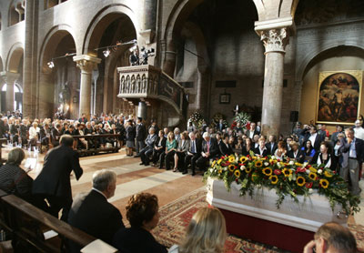 Rock stars, political leaders and loved ones wept and applauded after seeing a film of Pavarotti and his father Fernando performing the hymn Panis Angelicus, giving the singer a standing ovation that lasted several minutes. "The death of Pavarotti has made us feel poorer," said Archbishop Benito Cocchi, leading the service at the cathedral in Modena -- the town where Pavarotti was born the son of a baker and died a superstar. Fourteen pallbearers carried the coffin out of the cathedral to applause and cheers of "bravo" from the crowd as a recording of his most famous aria -- "Nessun Dorma" from Puccini's "Turandot" -- played over loudspeakers. As Pavarotti sang the song's famous line "All'alba vincero'" -- "At dawn I will be victorious" -- the air force's aerobatics team soared above the church, marking the blue sky with the green, white and red smoke in the colours of the Italian flag. U2 frontman Bono sat next to film director Franco Zeffirelli at the service, near Pavarotti's widow Nicoletta Mantovani, and ex-wife Adua who sat an opposite ends of the same pew. Fans crowding the sunlit square outside the 12th century cathedral watched the service on giant screens. The images were broadcast live on state television and the Internet. Bulgarian soprano Raina Kabaivanska opened the service, amid the cathedral's gilded frescos, with Ave Maria from Verdi's Otello. Another of Pavarotti's friends, blind Italian tenor Andrea Bocelli, sang Mozart's Ave Verum Corpus. The choir -- Corale Rossini -- was the same one in which both Pavarotti and his father once sang. EXCEPTIONAL GIFT Archbishop Cocchi remembered Pavarotti's life. "The story of a boy who had the natural gift of an exceptional voice which he cultivated with tenacity and thus became the leading figure among all the tenors of his time." "Nessun Dorma", which has become a soccer anthem, rang out at London's Wembley Stadium on Saturday ahead of a match between England and Israel and was due to be played in Milan at a match between France and Italy as a tribute to Pavarotti. Prodi recalled the singer's role as a cultural ambassador as well as his recordings and performances to promote peace. "He made music an instrument for life and against war. It's true that Luciano Pavarotti wanted to be remembered above all as a great opera singer, but we want to pay homage also to his great humanity," Prodi told mourners. Born to a local baker father and a cigar factory worker mother, Pavarotti trained as a teacher, dreamt of being a soccer star, but pursued a career in singing -- a passion instilled in him by his father, a keen amateur. Pavarotti shot to fame as an understudy in a performance of "La Boheme" at London's Covent Garden in 1963. He went on to popularise what had been an elite art form, performing as one of the "Three Tenors" with Placido Domingo and Jose Carreras in Rome during the 1990 soccer World Cup in Italy. Before the coffin was sealed, 100,000 mourners paid respects to Pavarotti, dressed in a tuxedo with a trademark handkerchief in his hand. On a wreath, his four-year-old daughter had left a colourful stick-figure drawing signed "Alice". "He seemed so small," said 51-year-old housewife Rosanna Cipriano of the singer whose generous girth and twinkly eyes were as famous as his voice. After an operation for pancreatic cancer last year, Pavarotti had hoped to finish a world tour but he died on Thursday at the age of 71, Pavarotti's coffin was taken to rest at the Montale Rangone cemetery near his villa outside of town, where his parents and his stillborn son Riccardo are buried. The private burial was attended by his family, including Alice, born to his second wife. Pavarotti also left three grown-up daughters from his first marriage. |