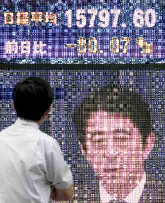 | A businessman looks at an electronic monitor displaying the Nikkei's close and a news report of Japanese Prime Minister Shinzo Abe announcing his resignation in Tokyo on September 12, 2007. Japanese stocks ended in negative territory on Wednesday after the shock resignation of Prime Minister Abe, with the Nikkei average down 0.5 percent as thin trade and political uncertainty took their toll. [Reuters] |
