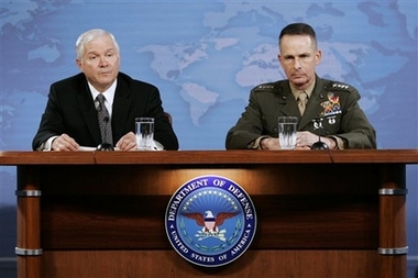 Defense Secretary Robert Gates (L) and outgoing Joint Chiefs Chairman Gen. Peter Pace take part in a Pentagon briefing, Friday, September 14, 2007. [AP] |