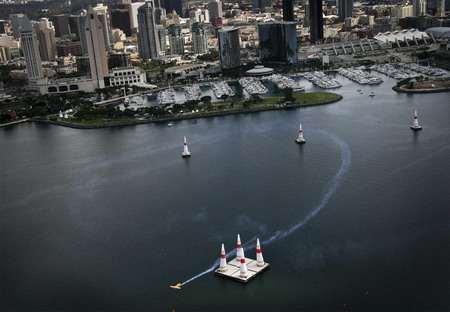 Britain's Nigel Lamb of Team Breitling flys past downtown San Diego during the qualifying session for the 9th stage of the Red Bull Air Race World Series in San Diego, California, September 21, 2007. [Reuters]