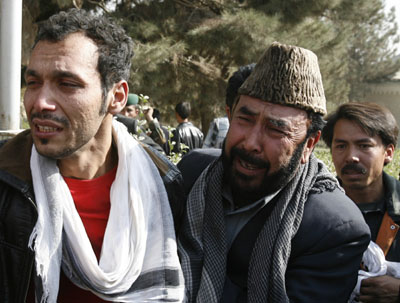 Relatives of one of the six Afghan members of parliament who was a victim in Tuesday's suicide bombing, grieve after the coffins were brought into the capital Kabul, November 7, 2007. Afghans began three days of national mourning on Wednesday for 41 people, many of them children, killed in the country's worst suicide attack. [Agencies]