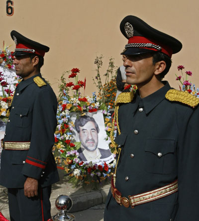 Updated: 2007-11-07 22:39 ![]() The honour guards stand by the coffin of Mostafa Kazemi, one of the six Afghan members of parliament who was a victim in Tuesday's suicide bombing, in Kabul November 7, 2007. Afghans began three days of national mourning on Wednesday for 41 people, many of them children, killed in the country's worst suicide attack. [Agencies]
