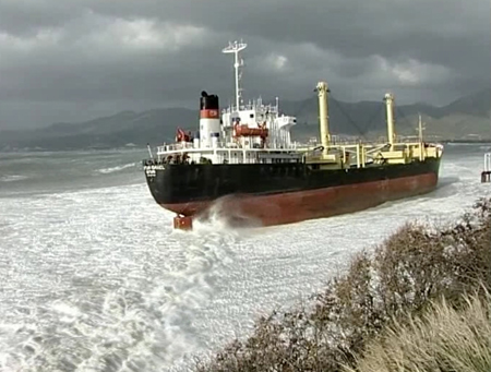 A vessel is seen after it ran aground near the settlement Kabardinka, 30 km (19 miles) southeast of Russia's Black Sea port of Novorosiisk, in this television grab November 11, 2007. [Agencies]
