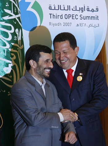 Iran's President Mahmoud Ahmadinejad (L) greets Venezuela's President Hugo Chavez during the 3rd OPEC Summit, in Riyadh November 17, 2007. [Agencies]