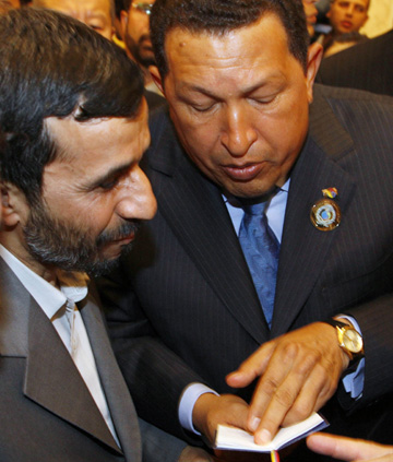 Venezuelan President Hugo Chavez (R) speaks with Iranian President Mahmoud Ahmadinejad during the 3rd OPEC Summit in Riyadh November 18, 2007. [Agencies]