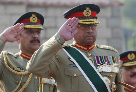 Updated: 2007-11-27 22:01 ![]() Pakistan's General Pervez Musharraf (R) salutes during the playing of Pakistan's national anthem at the Joint Staff Headquarters in Rawalpindi November 27, 2007. Musharraf said farewell to military colleagues on Tuesday as he prepared to become a civilian president ahead of January's general election. [Agencies]
