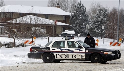 A police officer blocks the road to a youth ministry dormitory, back, on the campus of Faith Bible Church in Arvada, Colo., early on Sunday, Dec. 9, 2007. A gunman entered the dormitory and killed two residents while another two residents were injured and taken to hospital. [Agencies]