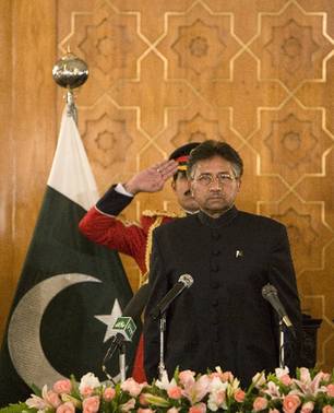 Pakistan's President Pervez Musharraf observes the national anthem after being sworn in at the President House in Islamabad Nov 29, 2007. Musharraf said that he would lift the state of emergency on Dec 15. [Agencies]