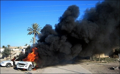 Scene of the battle : Black smoke billows into the sky as flames consume Iraqi police vehicles at the scene of a gunbattle between Iraqi policemen and insurgents in the town of Buhriz, north of Baghdad. [Agencies]
