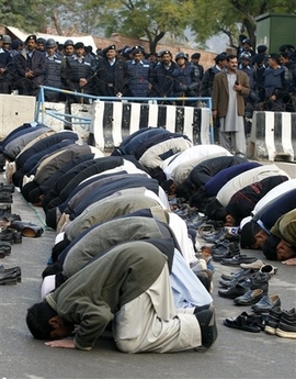 A group of lawyers and human rights activists, who are hoping to meet with deposed Chief Justice of Pakistan Iftikhar Mohammad Chaudhry, offer Eid-al-Adha prayers beside the police barricade near Chaudhry's residence in Islamabad, Pakistan, December 21, 2007. [Agencies]