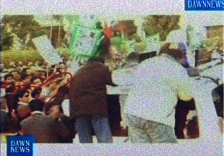 A TV frame grab taken on December 29, 2007 shows a still image taken by an amateur photographer of a man holding a handgun (circled in red) suspected of shooting Pakistani opposition leader Benazir Bhutto (R) in Rawalpindi. Bhutto died on December 27, 2007 after a gun and suicide bomb attack. [Agencies]