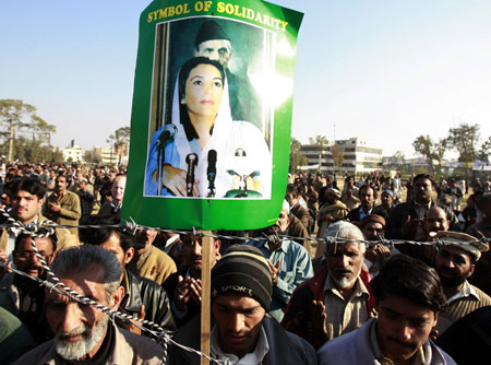 Supporters of slain Pakistani opposition leader Benazir Bhutto gather for special prayer for the rest of Bhutto's soul in Rawalpindi December 29, 2007. Masked gunman shot dead a supporter of Bhutto on Saturday, as violence triggered by her assassination entered third a day and and al Qaeda-linked militants denied killing her. [Agencies]