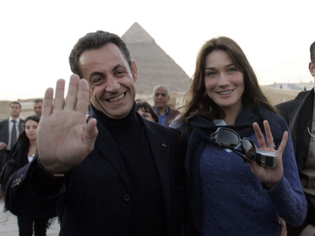 France's President Nicolas Sarkozy and his new girlfriend, Carla Bruni, gesture to photographers during a visit to the Giza pyramids in Cairo, December 30, 2007. Singer and former super model Carla Bruni is living a true love story with French President Nicolas Sarkozy, her mother told a newspaper on Sunday. [Agencies]