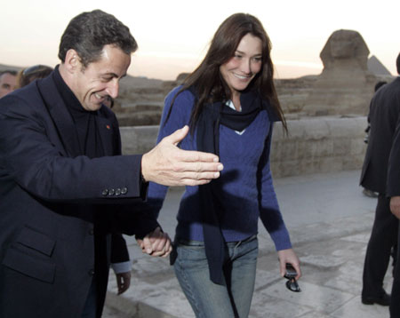 France's President Nicolas Sarkozy and his new girlfriend, Carla Bruni, walk together during a visit to the Giza pyramids in Cairo, December 30, 2007. Singer and former super model Carla Bruni is living a true love story with French President Nicolas Sarkozy, her mother told a newspaper on Sunday. [Agencies]