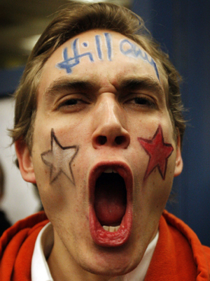 Freddie Sayers cheers during a campaign rally with Democratic presidential candidate US Senator Hillary Clinton (D-NY) in Des Moines, Iowa January 2, 2008. [Agencies]