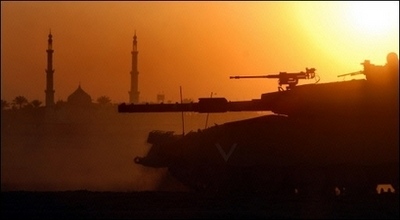 A mosque in the Gaza Strip forms a backdrop to an Israeli tank in this December 31, 2007 photo. [Agencies]