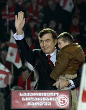 Georgia's presidential candidate Mikhail Saakashvili greets the audience as he holds a boy during a meeting with his supporters in Tbilisi January 4, 2008. [Agencies]