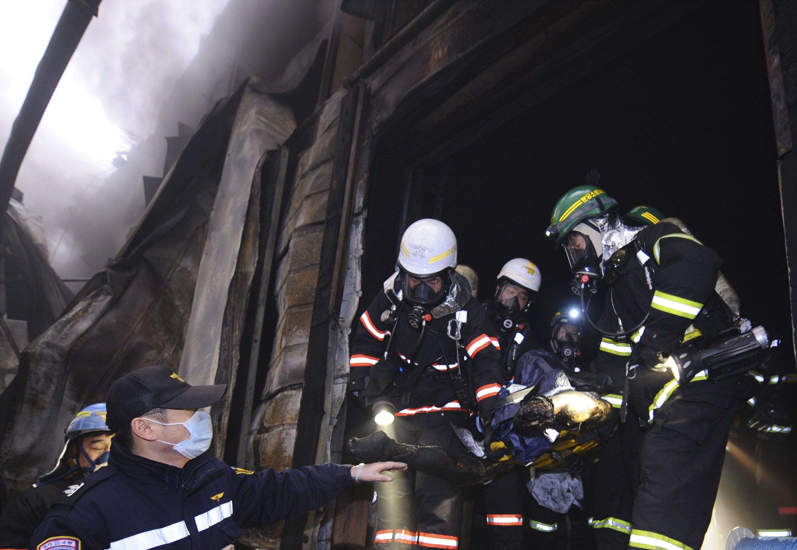 Firefighters carry the body of a dead worker at a warehouse in Icheon, about 60 km (40 miles) southeast of Seoul, January 7, 2008. At least seven people were killed and 32 others reported missing on Monday after a fire ripped through a warehouse for frozen goods under construction in Icheon, a fire official said. [Agencies]
