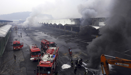 Most of the victims were so badly burned that they could not immediately be identified. The Chinese Ambassador to South Korea Ning Fukui met with South Korean Assistant Foreign Minister Shim Yoon-jo Tuesday morning and expressed great concerns about the casualties from the Icheon explosion. Ning urged the South Korean government to take appropriate measures to deal with the casualties during the meeting. The dead were found in the basement of the burned-out warehouse when the fire was extinguished late Monday, said Kim Jung-geun, a fire official in Icheon, about 80 kilometers (50 miles) south of the capital. Ten workers were hospitalized for burns and smoke inhalation, Kim said. Another seven people were able to escape from the building. A doctor at Bestian Medical Center in Seoul, which specializes in burn treatment, said four of the injured were in intensive care with burns over more than 40 percent of their bodies. The physician, who spoke on condition of anonymity, citing patient confidentiality, said one of the four was an ethnic Korean from China. China has a sizable Korean ethnic group and in recent years some have migrated to South Korea to seek work. Workers at the site were injecting urethane foam into the walls of the facility in the basement when the fire started, Kim said. A witness, identified only by her family name Song, told television station YTN that there were several huge bangs as the fire broke out, shaking the building and breaking the windows of a building next door. Kim said the explosions were caused by the fire, not the other way around. He said arson was not suspected. More than 500 firefighters battled the blaze. The badly burned condition of the bodies made identification difficult, Kim said. Only one of the dead had been positively identified, he said. Police were investigating but had to yet to find an exact cause, said a detective working on the case. He asked not to be named as the investigation was still under way. Cable news channel YTN showed firefighters battling thick black, brown and white smoke, some of it spewing from underground. Hoses atop fire trucks shot water toward the building. An official at Korea 2000, a logistics company that owns the facility, said the building had been under construction and was to be used for refrigeration. The official said workers were applying the final touches to the facility when the fire broke out. She requested anonymity, saying company rules prohibit employees from speaking to the media, and offered no other details. |