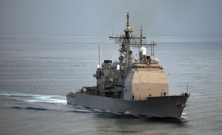 The guided missile cruiser USS Port Royal (CG 73) sails through the Pacific Ocean in this file photo taken on December 13, 2005. Five Iranian boats made aggressive maneuvers and showed hostile intent towards three US Navy ships at the weekend in the Strait of Hormuz, a major oil shipping route in the Gulf, the Pentagon said on January 7, 2008. [Agencies]